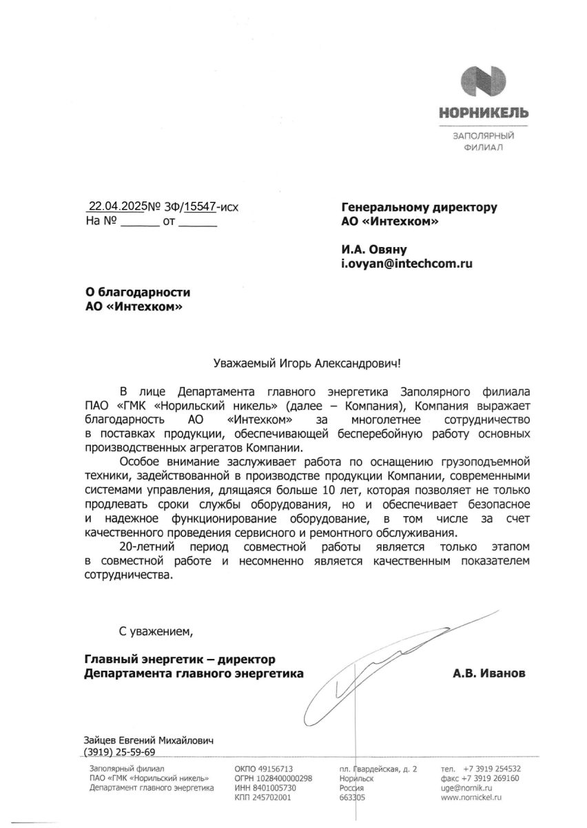 Заполярный филиал «Норникеля» к 25-летию «Интехкома»Последние новости