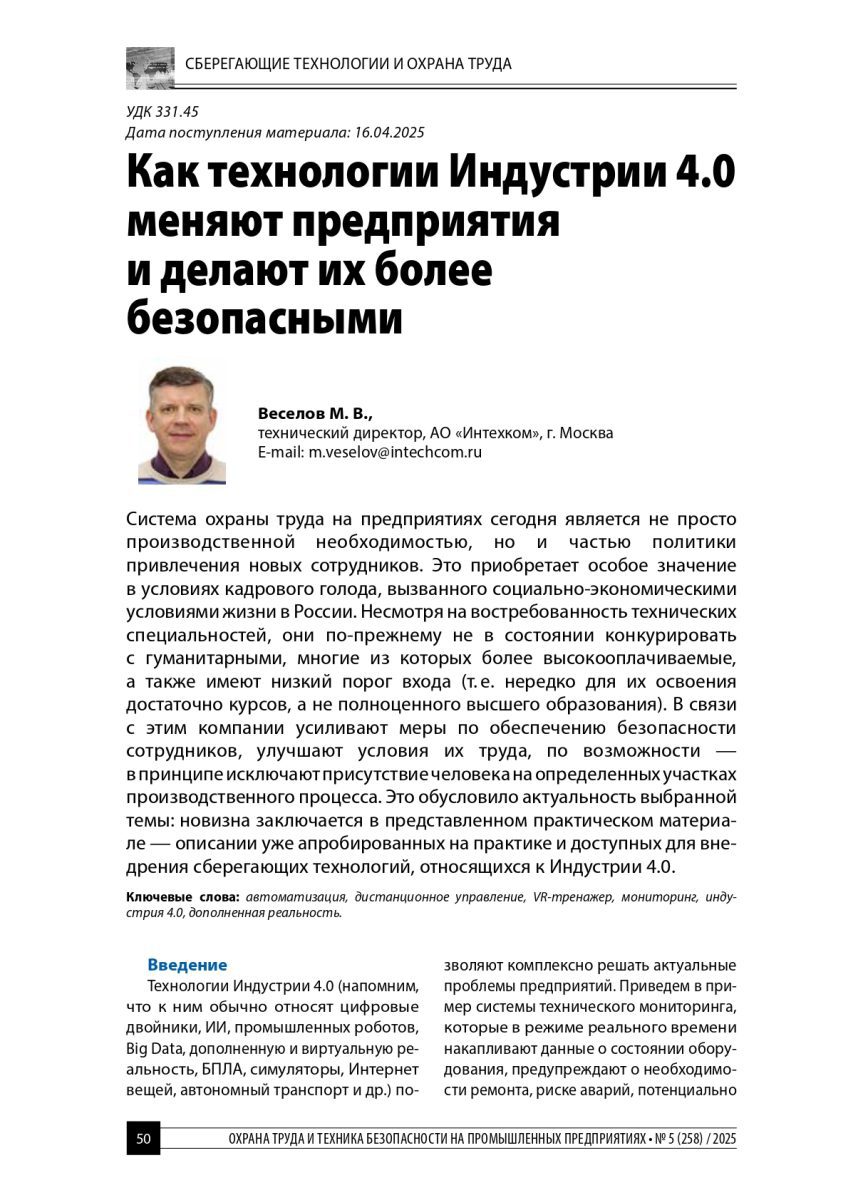 В журнале «Охрана труда и техника безопасности на промышленных предприятиях» (№5 (258) / 2025) вышла новая статья технического директора «Интехкома» Михаила Веселова. Материал посвящен актуальной теме, в примерах — кейсы нашей компании.