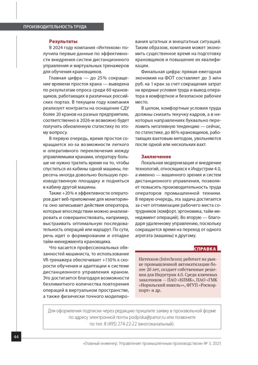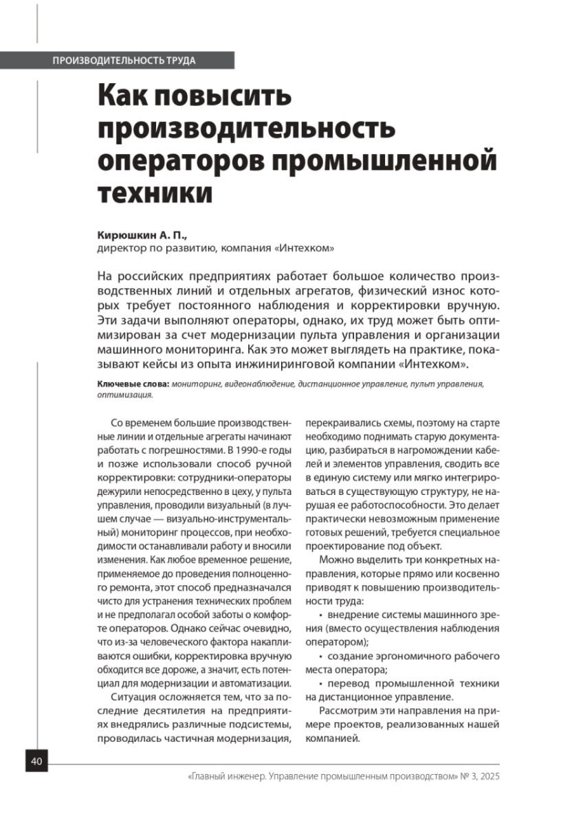 Новая статья Александра Кирюшкина, директора по развитию АО «Интехком». Для журнала «Главный инженер. Управление промышленным производством» он рассказал о том, как повысить производительность операторов кранов и другой техники.